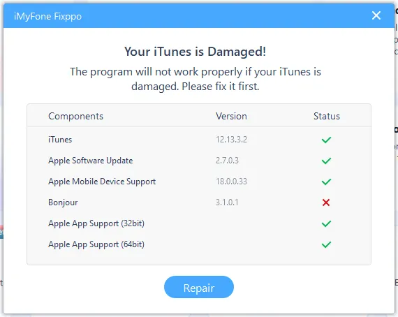 iMyFone Fixppo oferece um recurso para reparar erros do iTunes. Ele pode detectar automaticamente o iTunes instalado no seu PC e informar onde está o problema. Você pode clicar no ícone "Reparar" e o software baixará o driver de reparo e corrigirá o aplicativo iTunes.