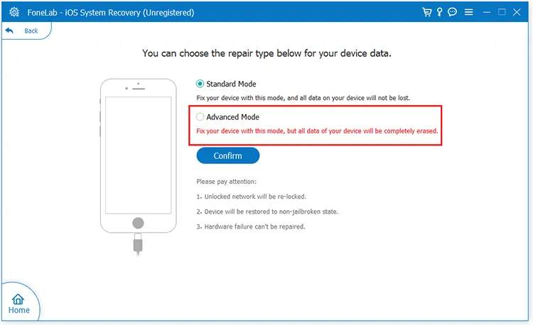 If the Standard Mode cannot fix your iOS device, you can choose the Advanced Mode, which will fix your device more effectively, but it will erase all your device data completely. Please remember to back up your important data in advance, or you will lose the data permanently.