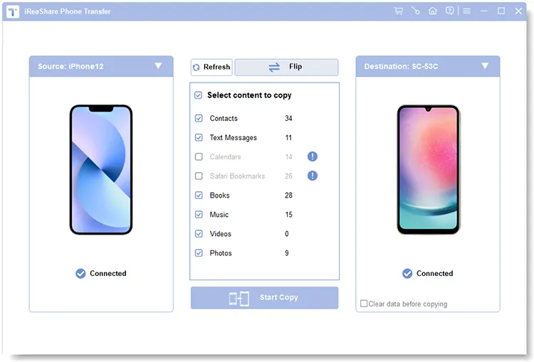 Step 2: You can check "Clear data before copying" if needed, which will delete the existing data on the receiver. This feature is only supported for Android devices. Next, select the file types you want, like contacts, photos, videos, apps, music, etc., and tap "Start Copy".