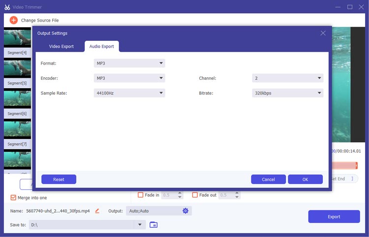 - To merge all clips into one cohesive video, check the "Merge into one" option at the bottom left of the Video Trimmer interface.